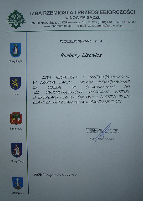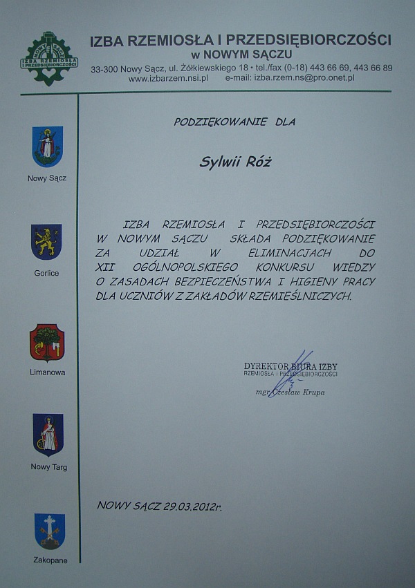 W dniu 29 marca 2012 roku odbył się w siedzibie Izby Rzemiosła i Przedsiębiorczości w Nowym Sączu etap regionalny XII Ogólnopolskiego Konkursu wiedzy o zasadach bezpieczeństwa i higieny pracy dla uczniów zawodu w rzemiośle.