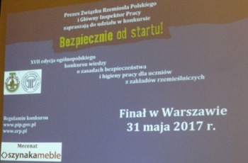 W dniu 31 maja 2017 r. odbył się w sali im. Jana Kilińskiego siedziby Związku Rzemiosła Polskiego w Warszawie przy ul. Miodowej 14 ogólnokrajowy etap i wielki finał Konkursu wiedzy o zasadach bezpieczeństwa i higieny pracy dla uczniów – młodocianych pracowników z zakładów rzemieślniczych „Bezpiecznie od startu”. Do finału zakwalifikowało się 46 osób z 23 Izb Rzemieślniczych z całej Polski. Po uroczystym rozpoczęciu Ogólnopolskiego Finału Konkursu zaprezentowano uczestników, a następnie omówiono regulamin oraz zasady finału konkursu, po czym rozdano uczestnikom testy do wypełnienia. Na wypełnienie testów uczestnicy mieli 1 godzinę czasu. W czasie sprawdzania testów i wyłonienie finalistów (sześciu indywidualnych i trzech drużyn) przez członków Komisji Konkursowej zorganizowano uczestnikom i ich opiekunom spacer po Starówce Stolicy, a następnie zaproszono na obiad. |