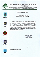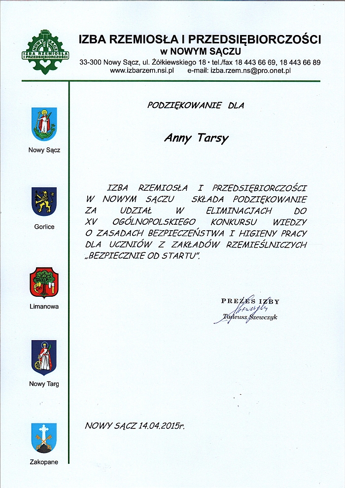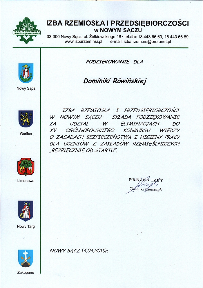 W dniu 14 kwietnia w siedzibie Izby Rzemiosła i Przedsiębiorczości w Nowym Sączu odbył się etap regionalny jubileuszowej XV Edycji Ogólnopolskiego Konkursu wiedzy o zasadach bezpieczeństwa i higieny pracy dla uczniów z zakładów rzemieślniczych „Bezpiecznie od startu”. W konkursie wzięło udział pięć 2-osobowych zespołów ze szkół w Zakopanem, Nowym Targu, Krynicy, Limanowej i Gorlic. Naszą szkołę reprezentował zespół składający się z dwóch uczennic klasy trzeciej Dominiki Rówińskiej i Anny Tarsa. Etap regionalny składał się z dwóch części – pisemnego testu zawierającego 95 punktów i trwającego 90 min. oraz części drugiej - ustnej, do której zakwalifikować mogło się tylko 6 uczestników. Nasze obie uczennice zakwalifikowały się do części ustnej, zajmując w kwalifikacji ogólnej – Dominika Rówińska trzecie miejsce, Ania Tarsa piąte. |