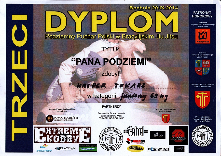 W dniu 20 września uczeń klasy pierwszej naszej szkoły Kacper Tokarz zajął PIERWSZE miejsce w swojej kategorii wagowej uzyskując tym samym tytuł "Pana Podziemi", na Podziemnym Pucharze Polski w Brazylijskim Jiu Jitsu. Zawody zostały zorganizowane w Kopalni Soli w Bochni. |