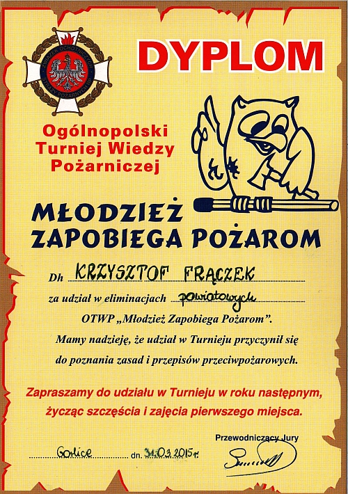 W auli Zespołu Szkół Zawodowych im. K. Pułaskiego w Gorlicach w dniu 31 marca odbyły się kolejne Eliminacje Powiatowe Ogólnopolskiego Turnieju Wiedzy Pożarniczej "Młodzież zapobiega pożarom". W rozgrywanym Turnieju w kategorii szkoły ponadgimnazjalne naszą szkołę reprezentował uczeń klasy II a Krzysztof Frączek. Relacja ze strony Zarządu Oddziału Powiatowego ZOSP RP w Gorlicach |
