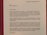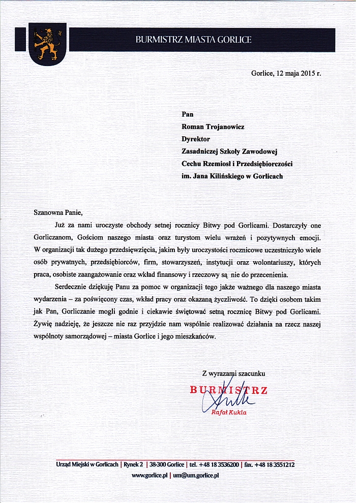 Burmistrz Miasta Gorlice Rafał Kukla skierował na ręce dyrektora naszej szkoły Romana Trojanowicza podziękowanie za pomoc w organizacji uroczystych obchodów setnej rocznicy Bitwy pod Gorlicami.