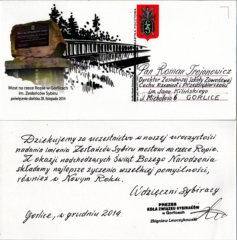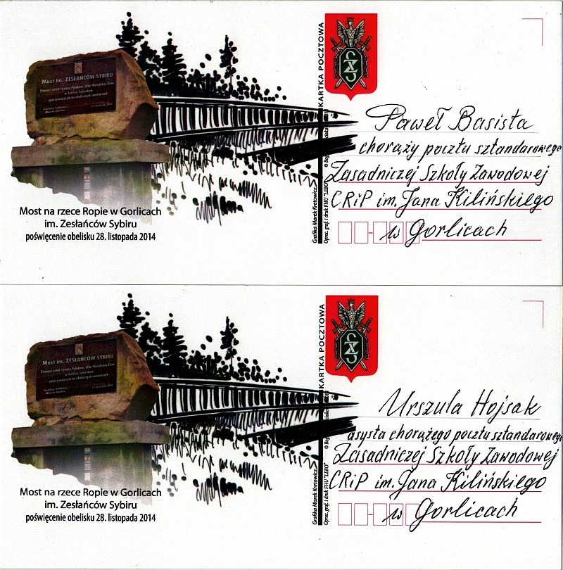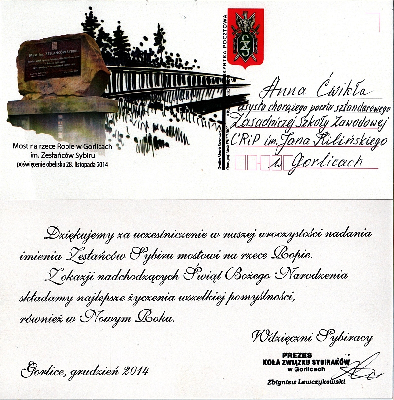 28 listopada 2014 r. w samo południe odbyła się uroczystość odsłonięcia obelisku przy moście nad rzeką Ropą w ciągu ulicy Parkowej połączona z nadaniem temu mostowi imienia "Zesłańców Sybiru". W uroczystości tej, na zaproszenie Burmistrza Miasta Gorlice Witolda Kochana oraz Prezes Związku Sybiraków Koło w Gorlicach Janiny Brzozowskiej, wziął udział dyrektor szkoły Roman Trojanowicz oraz szkolny poczet sztandarowy reprezentowany przez uczniów klasy pierwszej Pawła Basistę - chorąży, Urszulę Hojsak i Annę Ćwikła – asysta, Ewelinę Deda (zmiana asysty). Fotorelacja