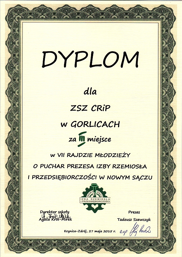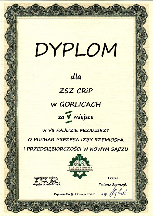 27 maja 2015 r. odbył się w Krynicy VII Rajd Młodzieży o Puchar Prezesa Izby Rzemiosła i Przedsiębiorczości w Nowym Sączu pana Tadeusza Szewczyka. W rajdzie wzięło udział sześć czternastoosobowych drużyn ze Szkół Cechowych i Izby z Nowego Sącza, Zakopanego, Limanowej, Krynicy-Zdroju i Gorlic, przy czym z Gorlic wzięło udział dwie drużyny. Więcej Fotorelacja