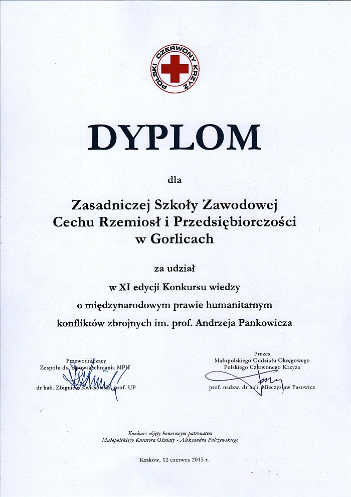 12 czerwca na adres szkoły przyszło podziękowanie za udział naszej młodzieży w XI edycji Konkursu wiedzy o międzynarodowym prawie humanitarnym konfliktów zbrojnych im. Andrzeja Pankowicza organizowanym przez Małopolski Oddział Okręgowy Polskiego Czerwonego Krzyża w Krakowie. |