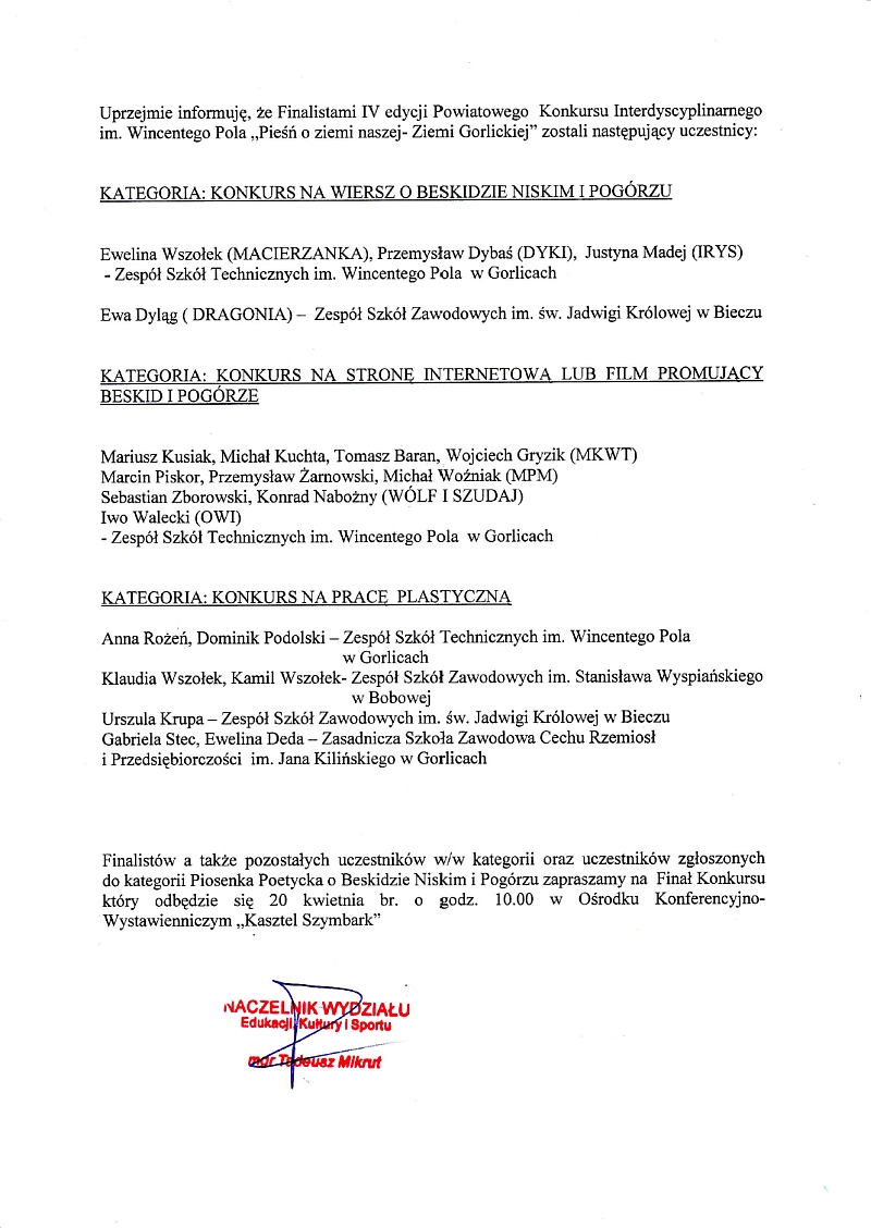 Poniżej otrzymana informacja podpisana przez Naczelnika Wydziału Edukacji, Kultury i Sportu mgr Tadeusza Mikruta.
