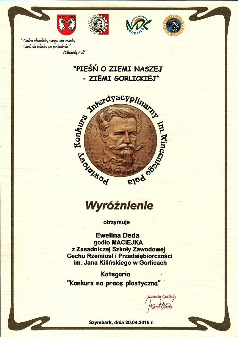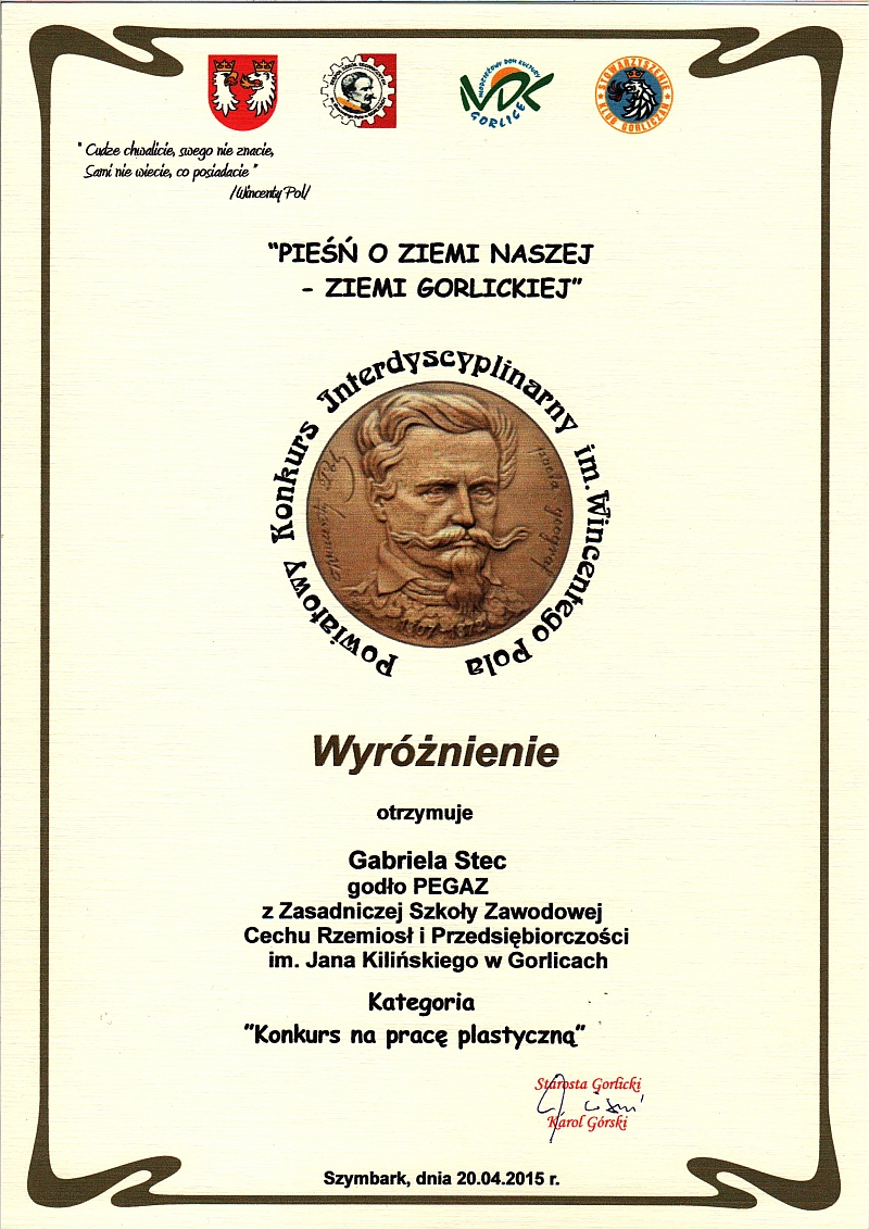 Dwie uczennice naszej szkoły Ewelina Deda i Gabriela Stec z klasy pierwszej zgłoszone zostały do Powiatowego Konkursu Interdyscyplinarnego im. Wincentego Pola promującego Beskid Niski i Pogórze Gorlickie "Pieśń o Ziemi Naszej – Ziemi Gorlickiej" w kategorii "Praca Plastyczna". Uczennice przygotowywały się do konkursu pod kierunkiem mgr Renaty Rybczyk. W dniu 14 kwietnia otrzymaliśmy informację o zakwalifikowaniu naszych uczestniczek do finału, który odbędzie się 20 kwietnia br. o godz. 10 w Ośrodku Konferencyjno- Wystawienniczym "Kasztel w Szymbarku".