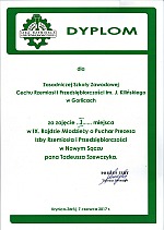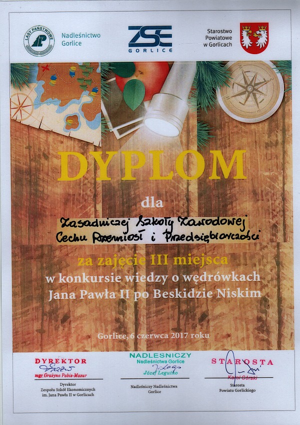 W dniu 25 kwietnia 2017 r. odbyło się w Ośrodku Konferencyjno-Wystawienniczym Kasztel w Szymbarku podsumowanie szóstej edycji konkursu ph. ”Pieśń o Ziemi Naszej – Ziemi Gorlickiej” im. Wincentego Pola. O Złote Pióra w czterech kategoriach: wiersz, piosenka o Beskidzie Niskim i Pogórzu, praca plastyczna oraz strona internetowa lub film, rywalizowali uczniowie szkół ponadgimnazjalnych powiatu gorlickiego. Więcej informacjiNaszą szkołę reprezentowało czworo uczniów – |