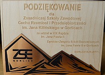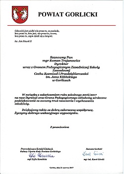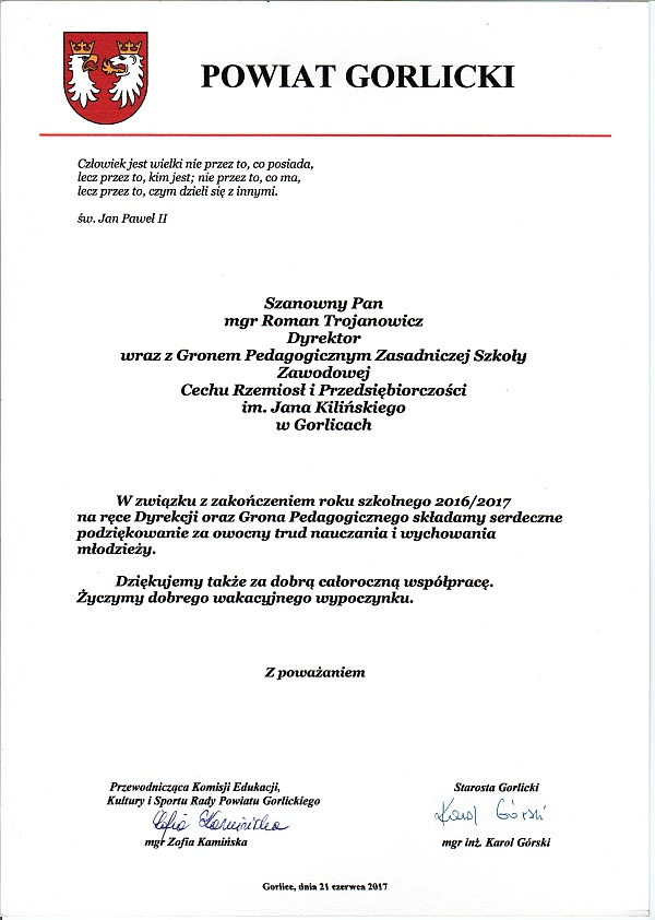 Na ręce dyrektora szkoły mgr Romana Trojanowicza wpłynęło ze Starostwa Gorlickiego podziękowanie dla Grona Pedagogicznego ZSZ CRiP im. Jana Kilińskiego za owocny trud nauczania i wychowania młodzieży oraz za dobrą całoroczną współpracę. |