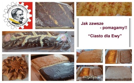 Uczniowie, Rodzice i nauczyciele naszej szkoły włączyli się aktywnie w akcję „ CIASTO DLA EWY” prowadzoną przez fundację WYJDŹ Z DOMU i Gazetę Gorlicką . Wspólnie przygotowaliśmy domowe ciasta: serniki, pierniki i przekładańce oraz różne ciasteczka – łącznie zebraliśmy ok. 60 placków. Nasze słodkości zawędrowaly na niedzielną akcję ( 22.01.2017r), gdzie po każdej Mszy św. były rozprowadzane wypieki. Na naszą młodzież zawsze można liczyć – są wrażliwi na problemy ludzkie i chętni do niesienia pomocy , szczególnie gdy chodzi o kolegę i jego rodzinę. Kamil- mąż Ewy jest absolwentem zaprzyjażnionego ZST, a jego brat Przemek – uczniem klasy IVa T ZST i tegorocznym maturzystą. |