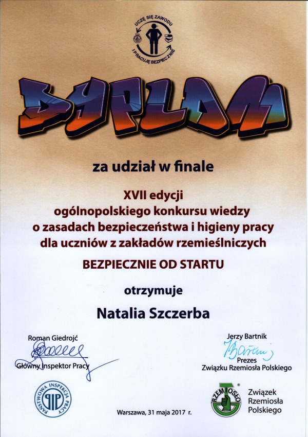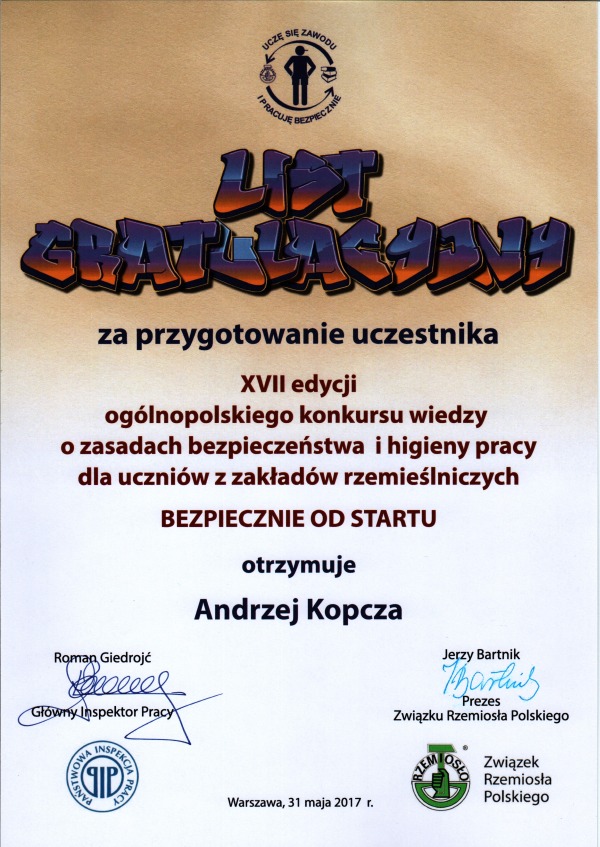W dniu 31 maja odbył się w sali im. Jana Kilińskiego siedziby Związku Rzemiosła Polskiego w Warszawie przy ul. Miodowej 14 ogólnokrajowy etap i wielki finał Konkursu wiedzy o zasadach bezpieczeństwa i higieny pracy dla uczniów – młodocianych pracowników z zakładów rzemieślniczych „Bezpiecznie od startu”. |