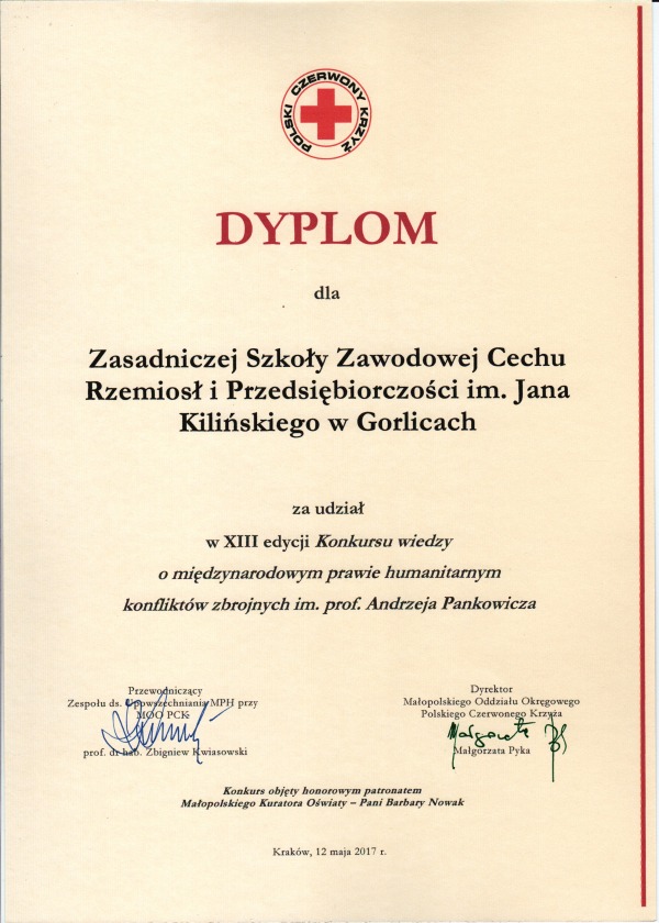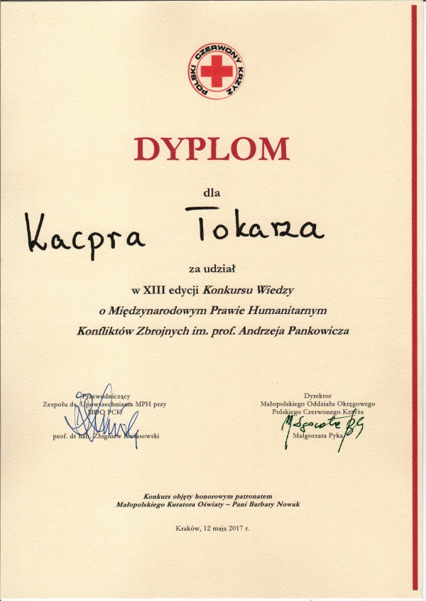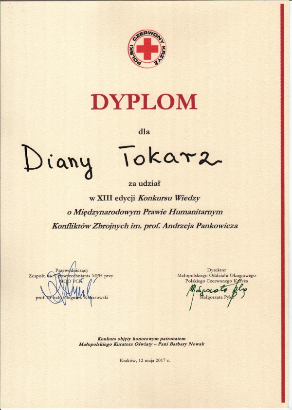 Uczennica Diana Tokarz z klasy I b i Kacper Tokarz z klasy III wzięli udział w finalnym etapie XIII edycji Konkursu Wiedzy o Międzynarodowym Prawie Humanitarnym Konfliktów Zbrojnych im. prof. Andrzeja Pankowicza, który odbył się w dniu 12 maja 2017 r. w Krakowie. Organizatorem cyklicznego konkursu jest Małopolski Oddział Okręgowy Polskiego Czerwonego Krzyża. Konkurs objęty był honorowym patronatem Małopolskiego Kuratora Oświaty – Pani Barbary Nowak. Info ze strony FB MOO PCK