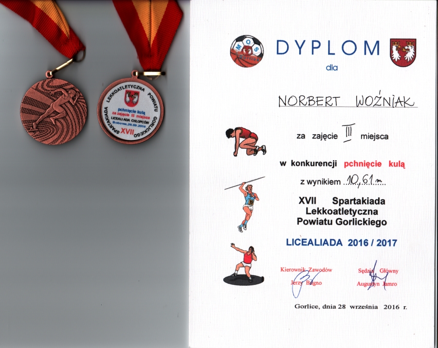 Dwa medale i dobre wyniki naszej młodzieży na XVII Indywidualnej Spartakiadzie Lekkoatletycznej Powiatu Gorlickiego dziewcząt i chłopców szkół ponadgimnazjalnych "Licealiada 2016/2017", która odbyła się 28 września na stadionie w Bobowej. Kilka zdjeć