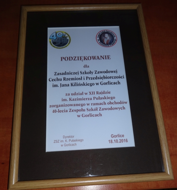 Uczniowie klasy I b wraz ze swoją wychowawczynią mgr Bożeną Szpila i mgr Jerzym Rubiczem wzięli udział w XII Rajdzie im. Kazimierza Pułaskiego zorganizowanym w ramach obchodów 40-lecia Zespołu Szkół Zawodowych im. Kazimierza Pułaskiego w Gorlicach, który odbył się w dniu 18 października 2016 r. Nasza uczennica Diana Tokarz w Konkursie Wiedzy o Kazimierzu Pułaskim i Konfederacji Barskiej zajęła I-sze miejsce. Podziękowanie Zdjęcia |
